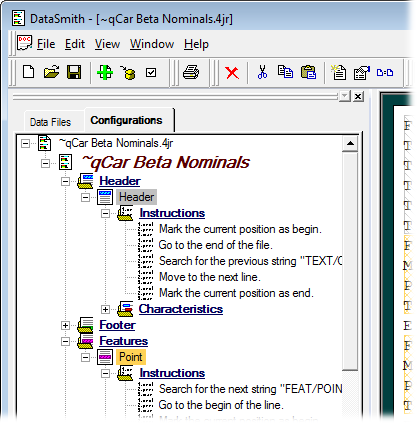 The Configurations tab contains information about the DataSmith (*.4datasmith) document currently open. The first level of the tree contains the name of the DataSmith document. The next level contains the Configs, or configurations of data types which make up the translator. With the components of a config, you can define headers, footers, comments and validations, and create features and characteristics. Creating more than one config in a DataSmith document allows you to identify and extract different types of information from the currently loaded data files.
