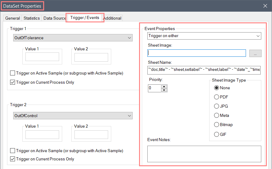 Trigger on both - Events will only be generated if data within the selected DataSet is triggered on the set Trigger 1 AND Trigger 2. For this example, this would occur if any of the data in the DataSet is "Out of Tolerance"AND"Out of Control"