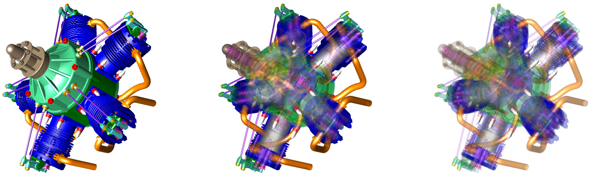 The opacity of the model can either be read from the CAD file or set on the View. Changing the transparency of the model allows you to see through a complex scene to view or select the Feature markers. See the topic Annot Properties - View Tab for View settings.