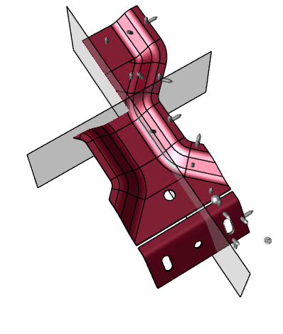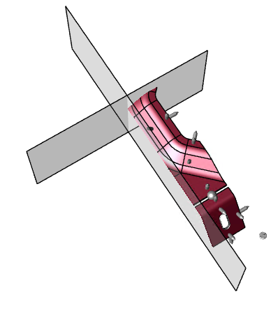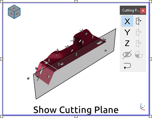 Cutting planes are used to hide geometry on one side of a plane. One or more cutting planes can be added to the model to create a View that shows only part of the model. The X, Y and Z axis planes can be used in an AND/OR function. Markers for the Features located on the part of the model 'cut' out are removed from the view if the cutting plane excludes the center point of the marker. When enabled, the cutting plane boundary sizes automatically adjust to fit within the bounding box of the model. The cutting planes have the option to show or hide the outline of the plane, but while the plane is hidden it cannot be moved.