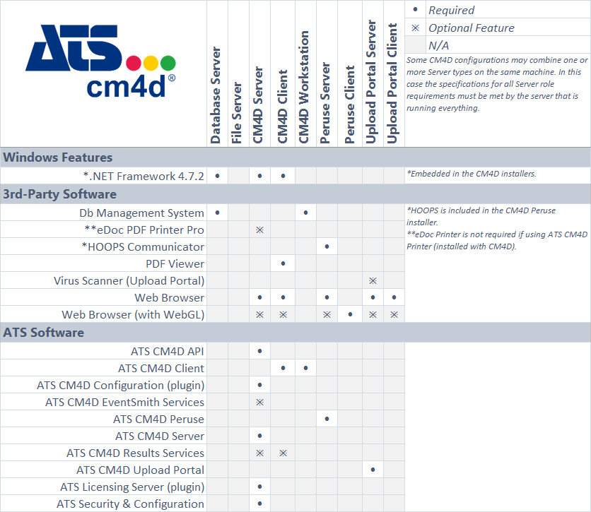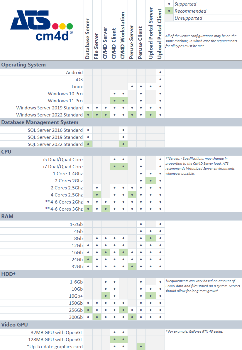 This information in this topic is intended to be a generic guide to use as a starting point in the planning of your ATS CM4D implementation of CM4D Server, CM4D Peruse, CM4D Upload Portal and support services. While the CM4D modules interact with one another and are mostly interdependent, if installed on separate machines then requirements might be considered individually. In cases where your system implementation combines one or more server configurations on the same machine, the minimum specifications for the combined system types must be met.