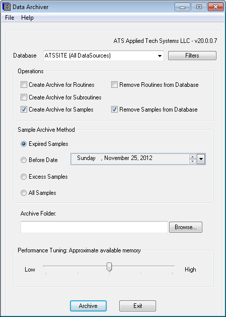 If you are running Data ArchiveĀ for the first time, be careful using the Before Date setting. If a recent date is set in the date field, and you have hundreds of samples in your database to be archived, Data Archiver will require are great deal of time and memory to run. It is recommended to initially set an older date, and then gradually moving the date up to avoid archiving all of your sample files at one time.