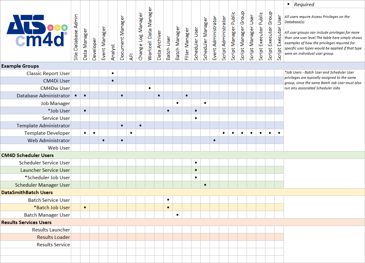 ATS CM4D has the option to control which Databases users can access and what each user is allowed to do within those Databases. Consider the following situations. A user starts CM4D and wants to connect to a new Database or use the Feature Editor to add a new feature to an existing Database. A second user opens CM4D Web in a browser window and wants to view reports. A third user wants to use DataSmith to output data to a DataSource.