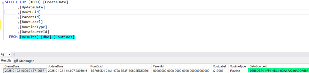 Results database Routines table after Data Command Generator option 1 Routines Payload.
