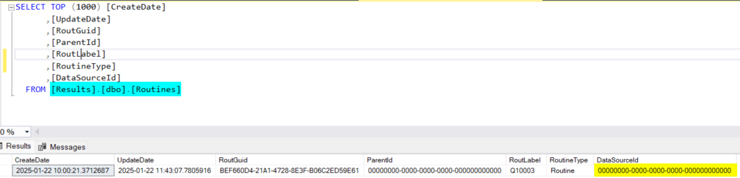 Results database Routines table before running Data Command Generator option 1 Routines Payload.