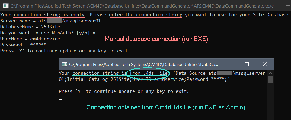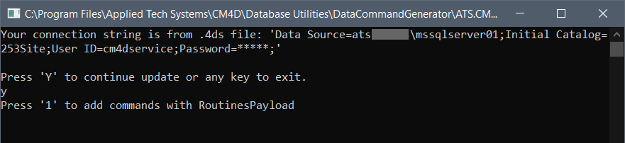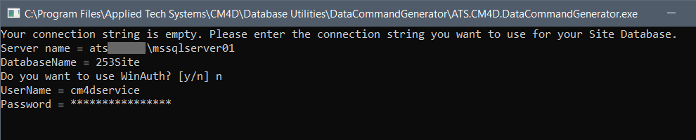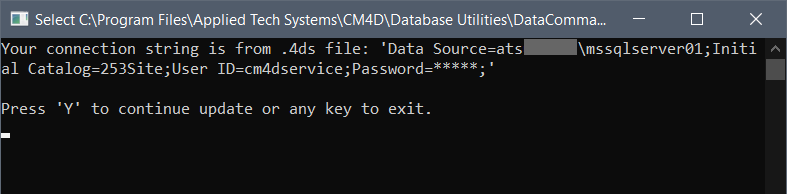 If the Cm4d.4ds file cannot be accessed when Data Command Generator is run, you are prompted to type the CM4D Site database connection information one line at a time. Once you have entered all of the required connection details, press 'Y' to continue.