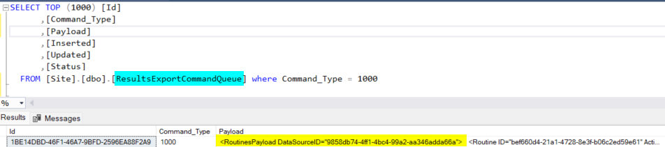 CM4D Site database Results Export Command Queue displaying the entry for Routines Payload.