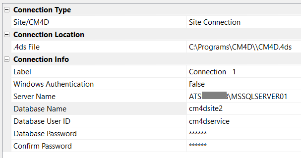 The Data Command Generator requires a Site connection to the SQL database. By default, this string is obtained from the Cm4d.4ds file (configured with DB Connect) registered with your CM4D installation. If this is not accessible, you are prompted to enter the string manually in the command window.