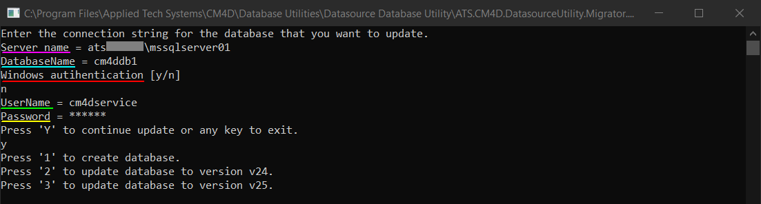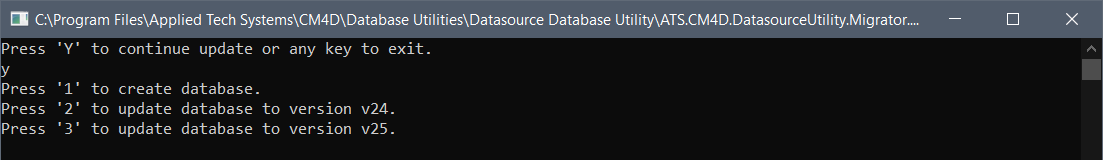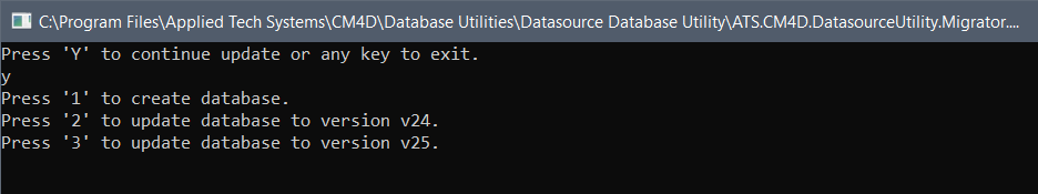 When Datasource Database Utility is run, you are prompted to type the CM4D database connection information one line at a time. Once you have entered all of the required connection details, press 'Y' to continue.