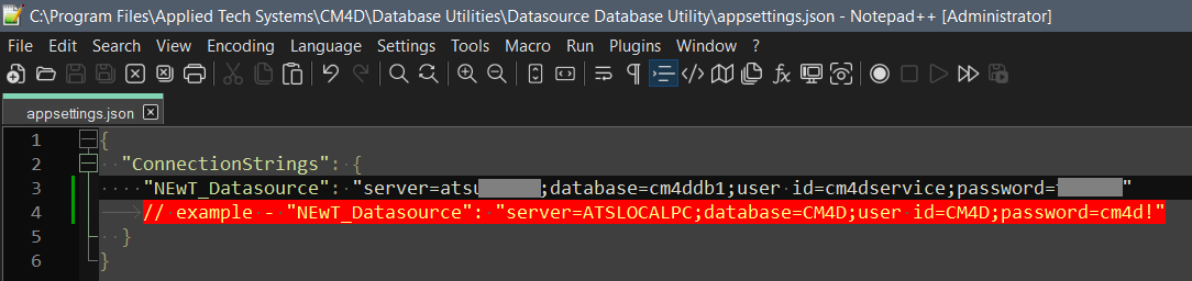 Before running the Datasource Database Utility, open the appsettings.json file in the .\Applied Tech Systems\CM4D\Database Utilities\Datasource Database Utility directory. Add or modify the database connection string as the "NEwT_Datasource" in the "ConnectionStrings" section: