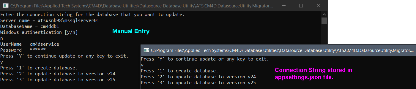 The Datasource Database Utility requires a connection to the SQL database. This string may be entered manually via the command window or connected automatically by storing the string in the appsettings.json file.