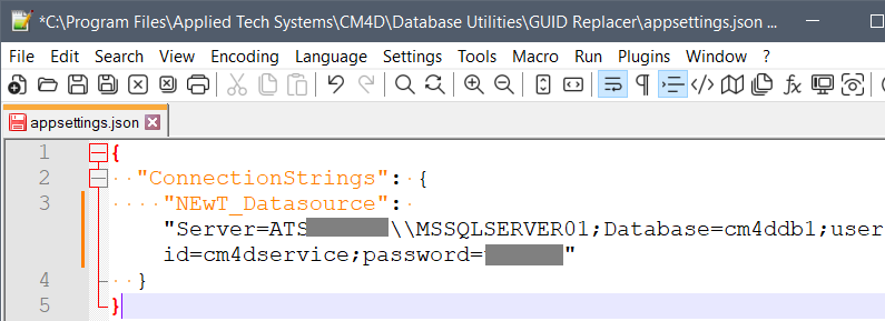 Before running the GUID Replacer, open the appsettings.json file in the .\CM4D\Database Utilities\GUID Replacer directory. Add or modify the database connection string as the "NEwT_Datasource" in the "ConnectionStrings" section: