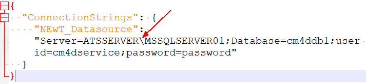 "NEwT_Datasource": "Server=(local)\\MSSQLSERVER01;Database=cm4ddb1;User Id=cm4dservice;Password=cm4d!"