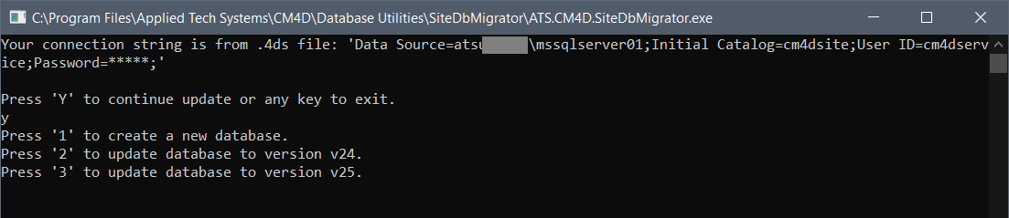 The Site Database Utility requires a Site connection to the SQL database. By default, this string is obtained from the Cm4d.4ds file (configured with DB Connect) registered with your CM4D installation. If this is not reachable, you are prompted to enter the string manually in the command window.