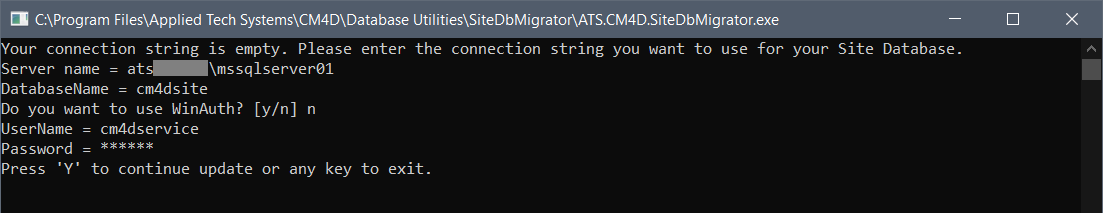 If the Cm4d.4ds file cannot be accessed when Site Database Utility is run, you are prompted to type the CM4D Site database connection information one line at a time. Once you have entered all of the required connection details, press 'Y' to continue.