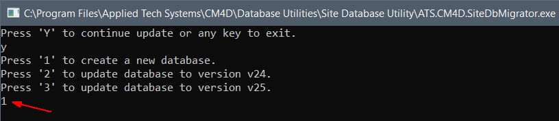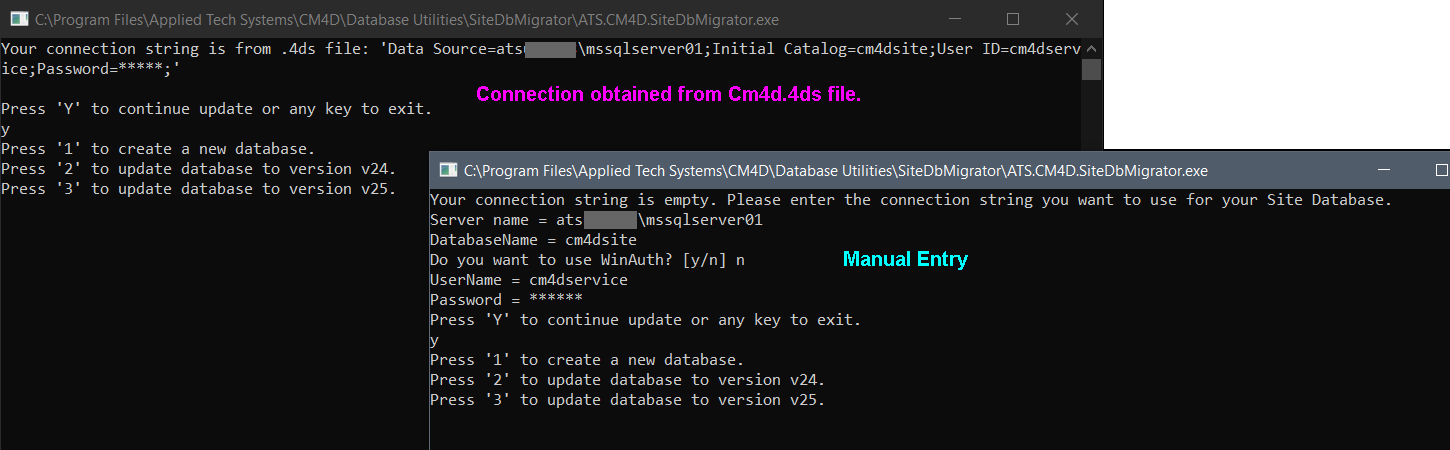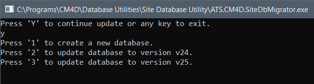 The Site Database Utility is a simple command prompt tool that executes all the scripts necessary to create a new CM4D Site database or upgrade a v24 or v25 Site database to the latest site database schema. Connection information can be obtained from the CM4D.4ds file (via DbConnect) or entered manually. This utility is included with CM4D Server installer and should only be run by users with a clear knowledge of CM4D and its databases.