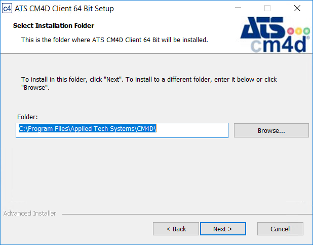 The default installation folder is C:\Program Files\Applied Tech Systems\CM4D\.