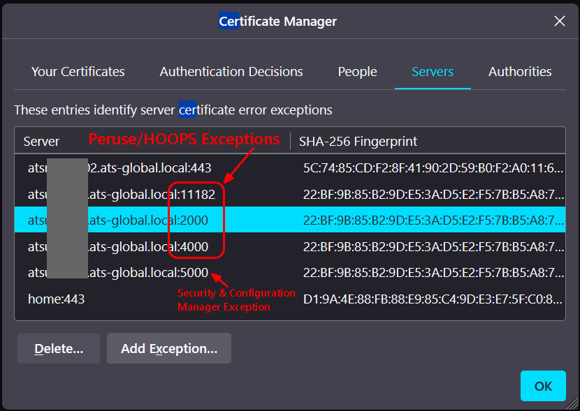 Add the full URL for the HOOPS server and any other CM4D pages (Peruse, Upload Portal, etc.) that use a self-signed certificate.