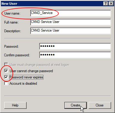 Enter a User name (e.g., CM4D_Service).
