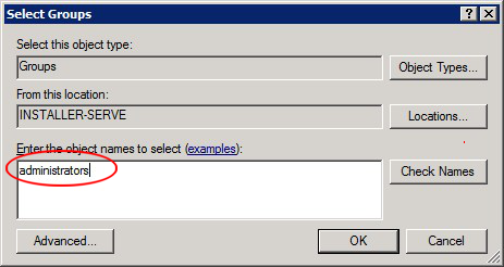 Enter the object name for your administrator account (e.g., Administrators) and click Check Names.