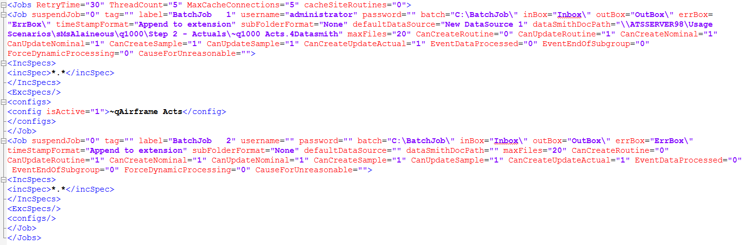 Unlike the Scheduler and Scheduler Launcher settings files, the DataSmith Batch files are managed via DataSmith Batch Manager interface. It does not require any changes to be made manually to the raw xml file. However, you may choose to edit the settings using the XML tags if you choose. See below for an example.