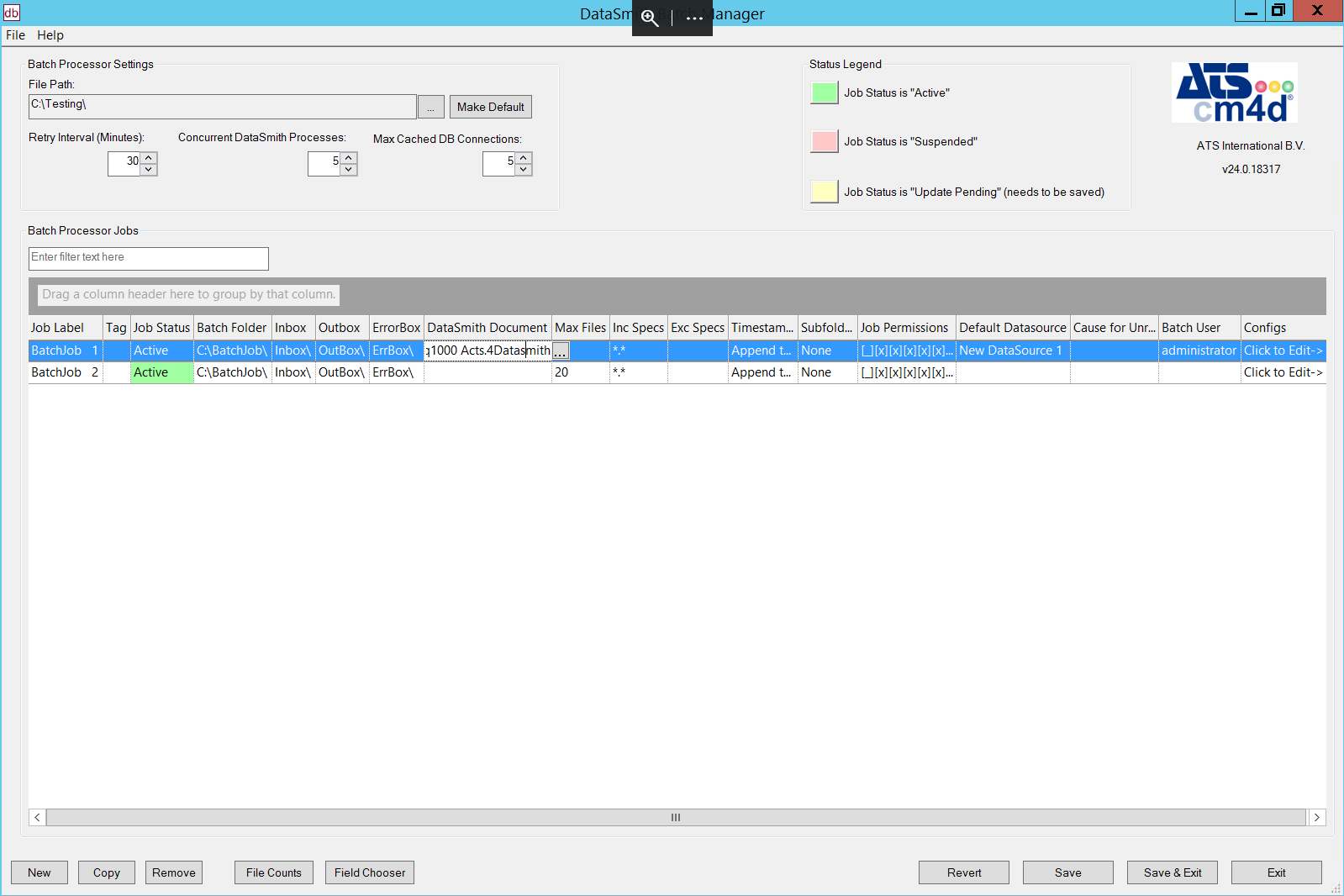 The DataSmith Batch service monitors folders and handles data files relating to DataSmith Batch processing. Connects DataSmith Batch to the CM4D database, assigns jobs to users, creates Batch folders and monitors the Batch folders for any activity.