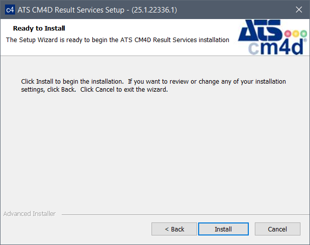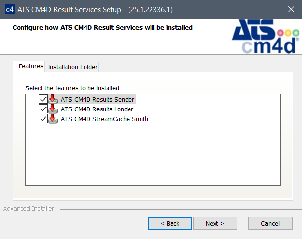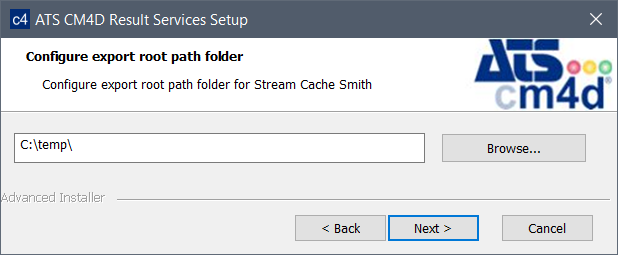 - The default options provided installs the Results Sender, Results Loader and StreamCacheSmith Windows Services to C:\Program Files\Applied Tech Systems\ATS CM4D Results Services\.