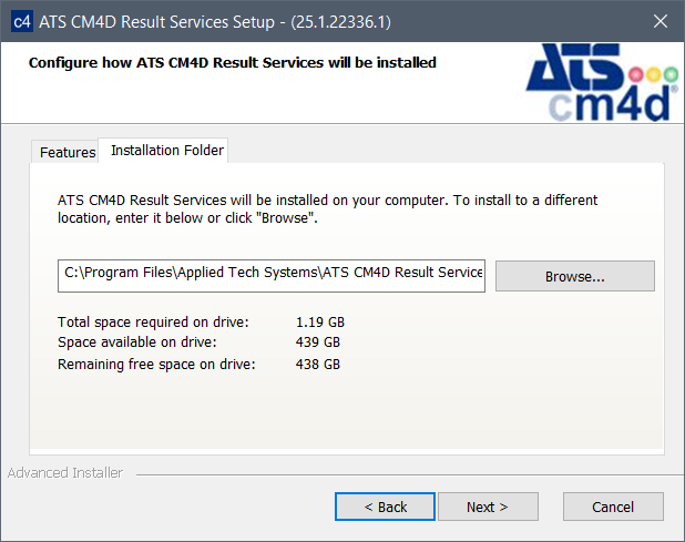 - Installation Folder: By default, the selected services are installed to C:\Program Files\Applied Tech Systems\ATS CM4D Results Services\. To change the installation folder, go to the Installation Folder tab and either enter a folder path or browse to a folder.