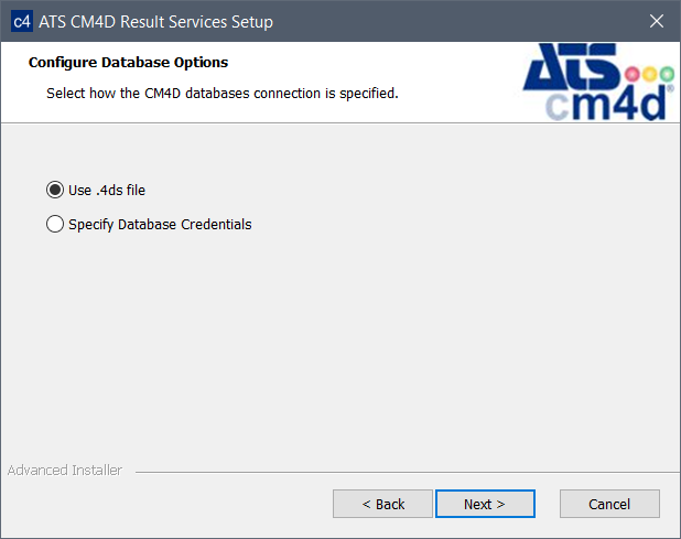 - Use .4ds File - If CM4D is installed on this machine, the services obtain database connection information from the DbConnect database connection file (CM4D.4ds) registered on the local system. The 4ds file provides both the Site Connection and the Results database connection strings to the Results Services.