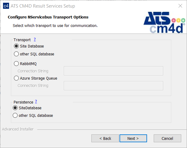 - Select a Transport option:Transport option:The NServiceBus transport is the way the messages are sent from one node to another. The system can be a distributed deployment, such as a local CM4D Site database and a cloud-based Results database. There are multiple transport options available. The transport is configured by selecting the Transport option during the Results service installation. The Results services must be connected to the same database and have the same transport type as the ServiceControl configuration you are using.