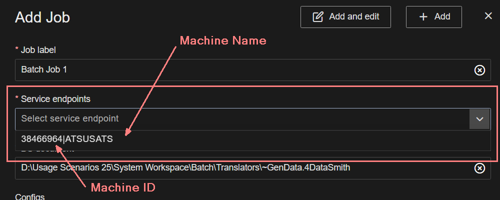 When a new job is added in the DataSmith Batch blade of CM4D Configuration, all self-registered DataSmith Batch Proxy Agents appear in the Service Endpoints dropdown list (Machine ID/Name).