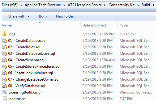 The ATS Licensing Server requires a database, completely separate from the CM4D Databases. This database is not set up by the ATS Licensing Server installer, so it will need to be created using the scripts found in the Connectivity Kit directory. By default, this can be found here: C:\Program Files (x86)\Applied Tech Systems\ATS Licensing Server\Connectivity Kit\Build