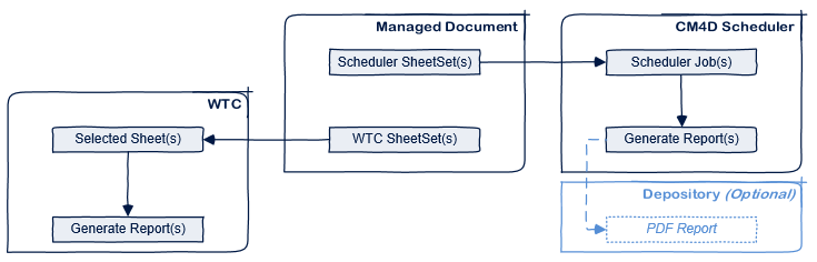 In v21, a report is now defined by the Managed Report assigned to a job in Scheduler or selected for printing in CM4D Web (the successor of WTC). A Managed Report is defined by the contents of one or more SheetSets, but it is not limited to a single Managed Document. It can be comprised of multiple SheetSets from different Managed Documents. The defined Managed Report allows Scheduler or CM4D Web to generate reports that combine SheetSets from multiple Managed Documents into a single PDF.
