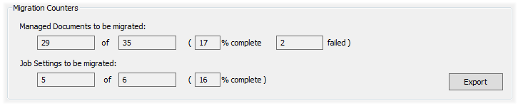 These fields provide feedback on how the Managed Document migration is progressing. The first field is how many documents are left to be migrated, and the second is the total number of Managed Documents that needed to be migrated. An overall percent complete is provided to help you gauge how long the entire process should take. A Failed field is provided to tell you how many Managed Documents have Failed the migration. Any failed documents will need to be analyzed to find out why they failed, so Export the feedback to help determine what documents failed.