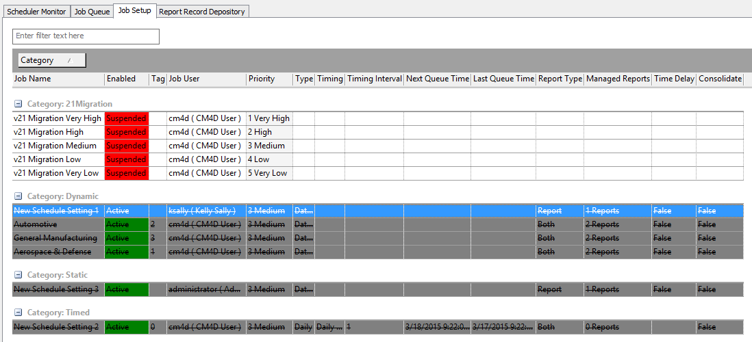 The Migration jobs are added to CM4D Scheduler Manager Job Setup tab and will be assigned Managed Documents, Users and Priorities based on the information you provided in the v21MigrationMapManDocs.txt file. The number of Migrations Jobs created depends on how you set up your Managed Document map file.