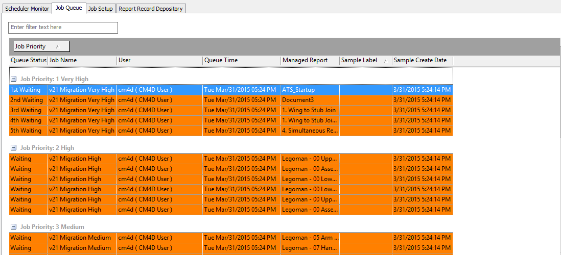 In the CM4D Scheduler Manager Job Queue tab, all Migration jobs will appear highlighted in Orange. If you do not see these right away, try clicking the Refresh button, or if you have Auto Refresh enabled, just wait for a few seconds.