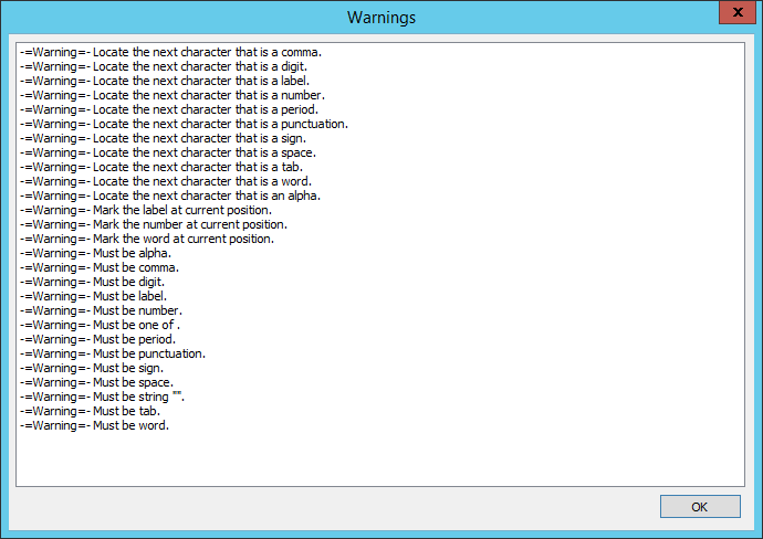 The new definitions apply to all 'Locate' and 'Must be' instructions, as well as a subset of the 'Mark' instructions (Label, Word, and Number). If a translator created in v21 or earlier contains any of the effected instructions, a Warning dialog will appear listing the instructions that occur in the document.