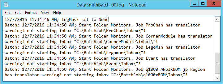 Any translators used by DataSmithBatch must be cleared of all Warnings before the job will run. Data files will remain in the Inbox until the translator is cleared of all Warnings, saved, and the DataSmithBatch service is restarted.