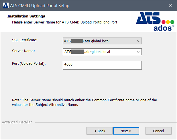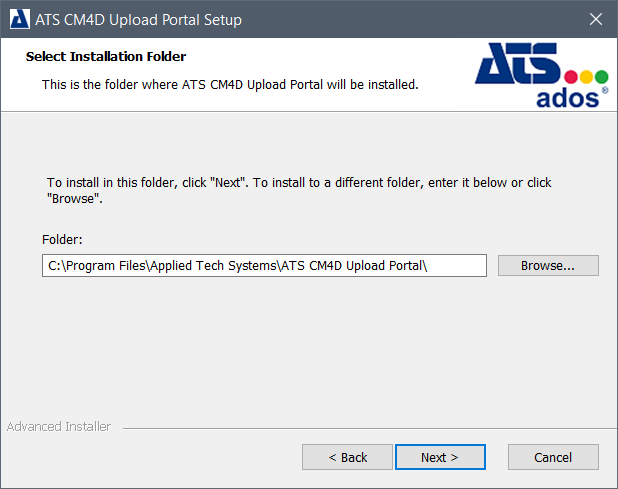 The default option is to install the Upload Portal to C:\Program Files\Applied Tech Systems\ATS CM4D Upload Portal\. Most installations will use the default path provided, but you can modify where it is installed.