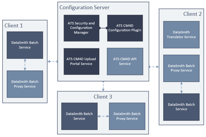 In this example, the configuration tool and the application are installed on a central server. The supporting services are installed on several connected clients, with several clients specifically for DataSmith Batch which allows for a large number of files to be processed simultaneously.