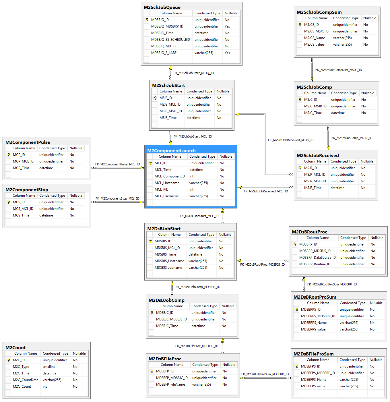 | [M2SchJobReceived] | Table; Foreign Keys - MCL (M2ComponentLaunch); MSJS (M2SchJobStart) | ||