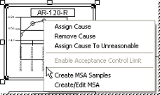 Samples created using the Create MSA Samples method will be available immediately in the DataSource tree, within the Query where the selected Feature is associated. To create samples using the Create MSA Samples process, right click a point on an existing chart (as though adding a Cause) and select Create MSA Samples from the context menu.
