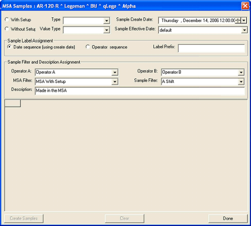 In order to use Sample Filters when creating MSA samples, you must have them defined in your Database and your Cm4d.ini file. Below is a table depicting the Cm4d.ini setup required. For this example, Filters O, M, and S are used as the Operator, MSA, and Sample filters, but you may use ANY FILTER you like for these fields: