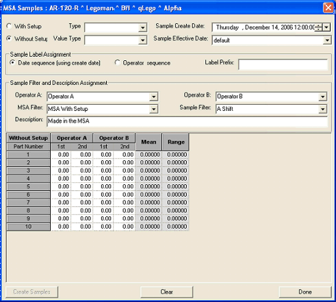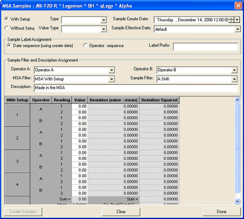 The Create MSA Samples grid is dynamic, based on the Study Type selected, as per the requirements defined in the Ford SPC manual. Enter your Values in the grid. The white cells are user-definable, while the grey cells are calculated automatically and cannot be modified.