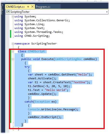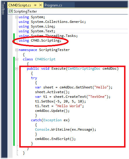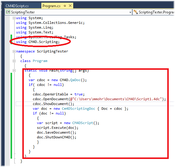 Set up the CM4DScript class. Make sure to add the using statement.