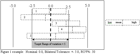 ROV Target is considered acceptable when the mean for a DataSet row falls within a target range of variation as centered on the nominal and defined by the provided ROV% and the range for a DataSet row is less than the target range of variation defined by the provided ROV% and the range falls within the target range as centered on the nominal. In the above example only case 1 would be acceptable.