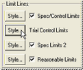 To access Trial Limit styles, make sure your control chart has trial control limits activated, then open the annotation's chart plot space dialog. Click one of the Lines buttons to open the Chart Lines dialog, from which the Trial Control Limits Style Properties dialog can be opened.