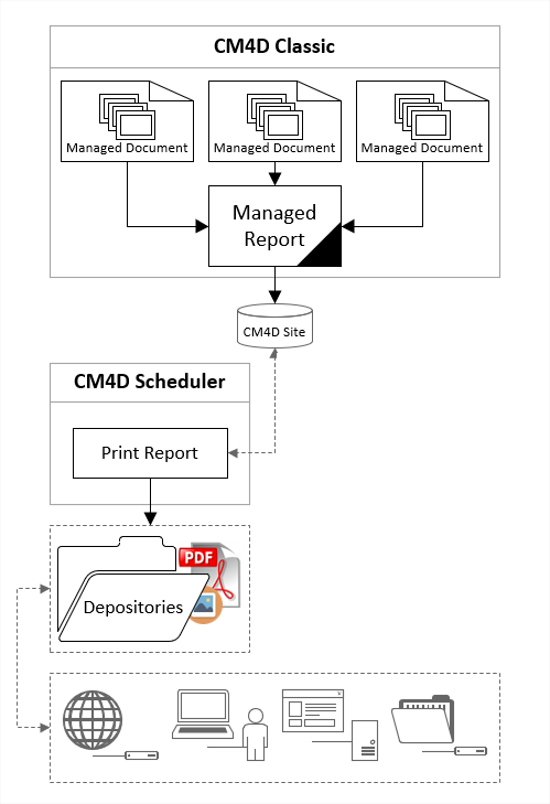 CM4D Scheduler uses Managed Reports to generate PDF reports. A report is printed for each Managed Report assigned to the Scheduler job. Each report contains all the SheetSets that are assigned to the Managed Report. The order in which the SheetSets are printed is determined by the definition of the Managed Report.