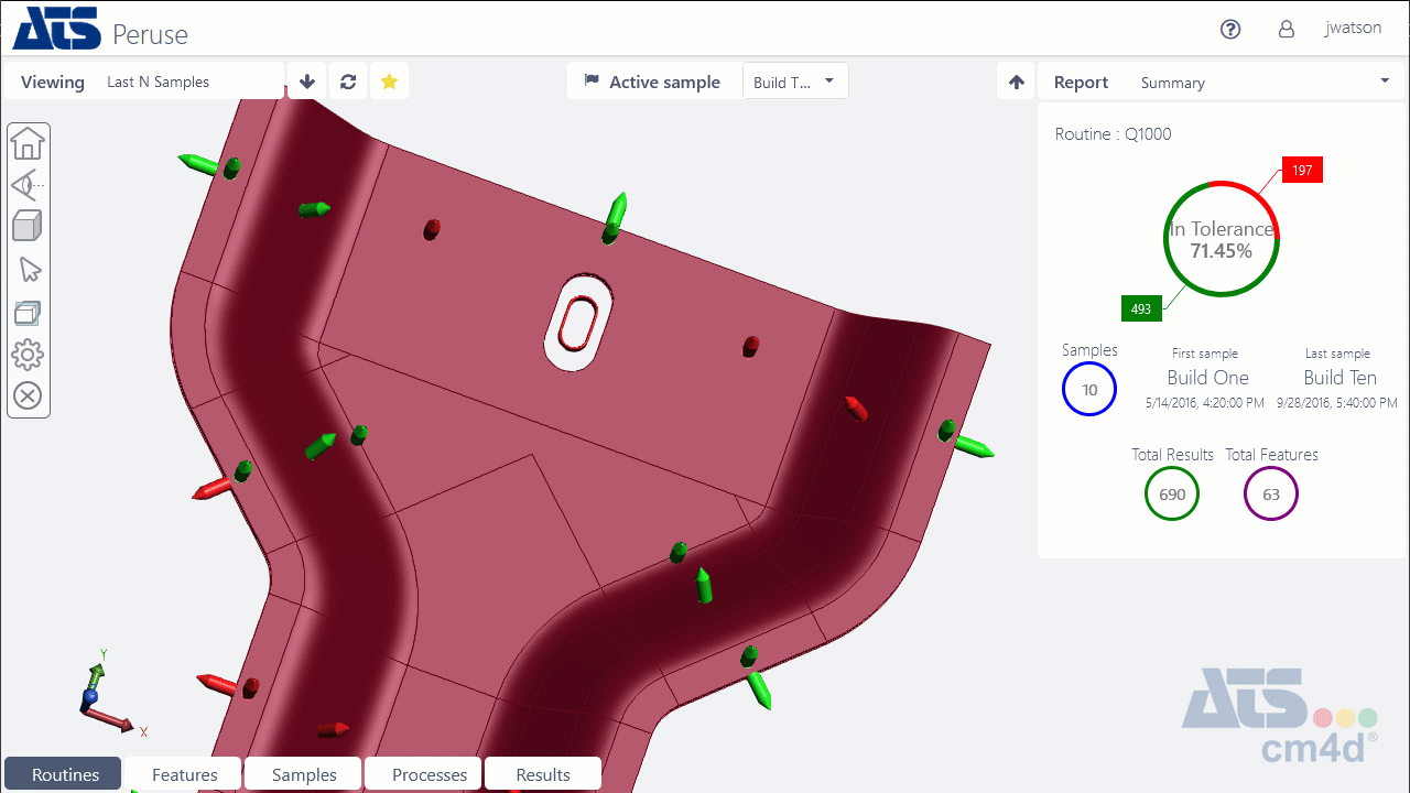 Selecting a row of data in the Feature grid also selects the Feature Marker on the 3D model, and choosing a Process or Result in the grid shows the data the Report panel.
