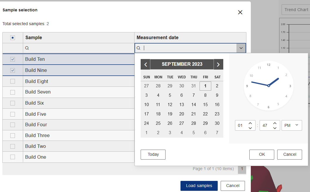 Loads samples with a create date that fits within the set parameters for 'Date from' and 'Date to'. Click the dropdown arrow in the date field to open the calendar control and pick a date. Alternatively, you can click in the date area and type the date into the field.
